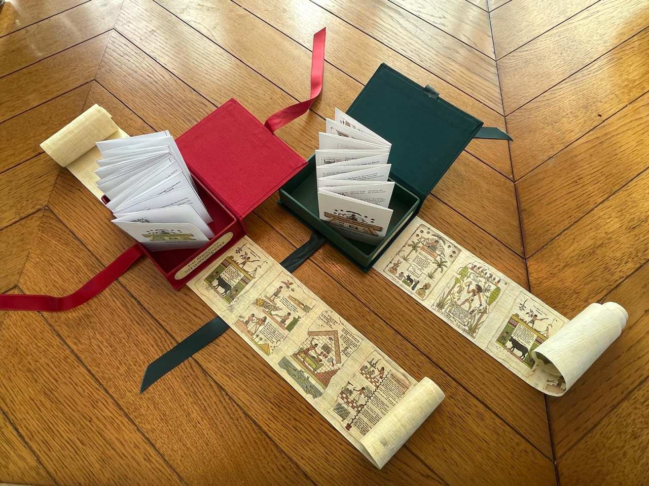 Mini-Papyrusrollen “Der Aegyptische Struwwelpeter” 111 x 7.4 cm, erhältlich in einer ansprechenden Archivschachtel in Deutsch und Englisch.